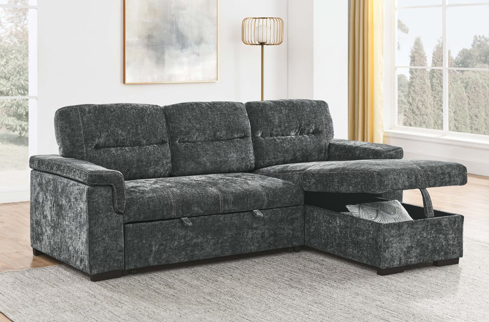 | T1218 | Pull-Out Sofa Sectional | Sofa-100″W 63″D 39″H | Chenille Fabric | Midnight Grey |